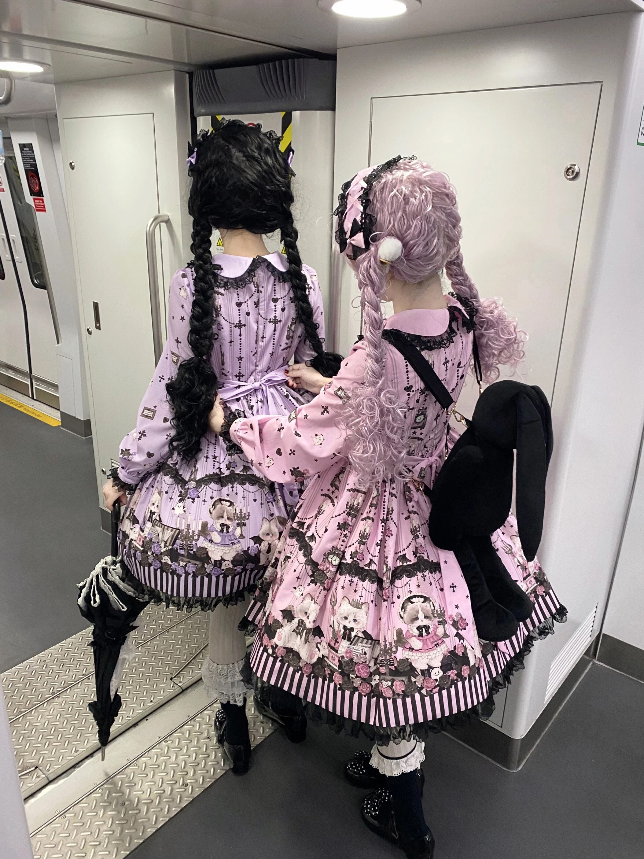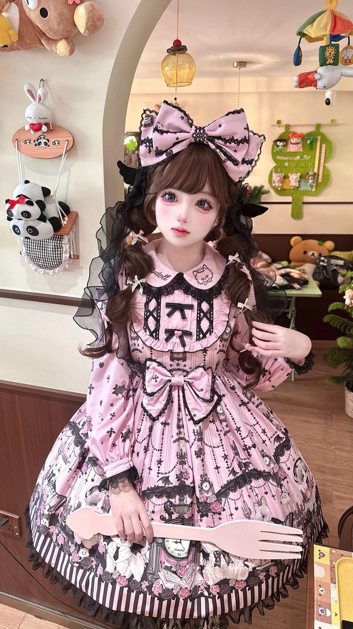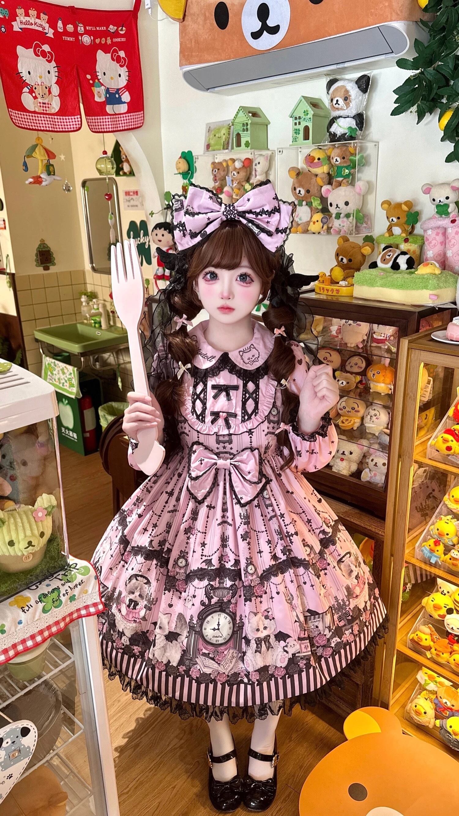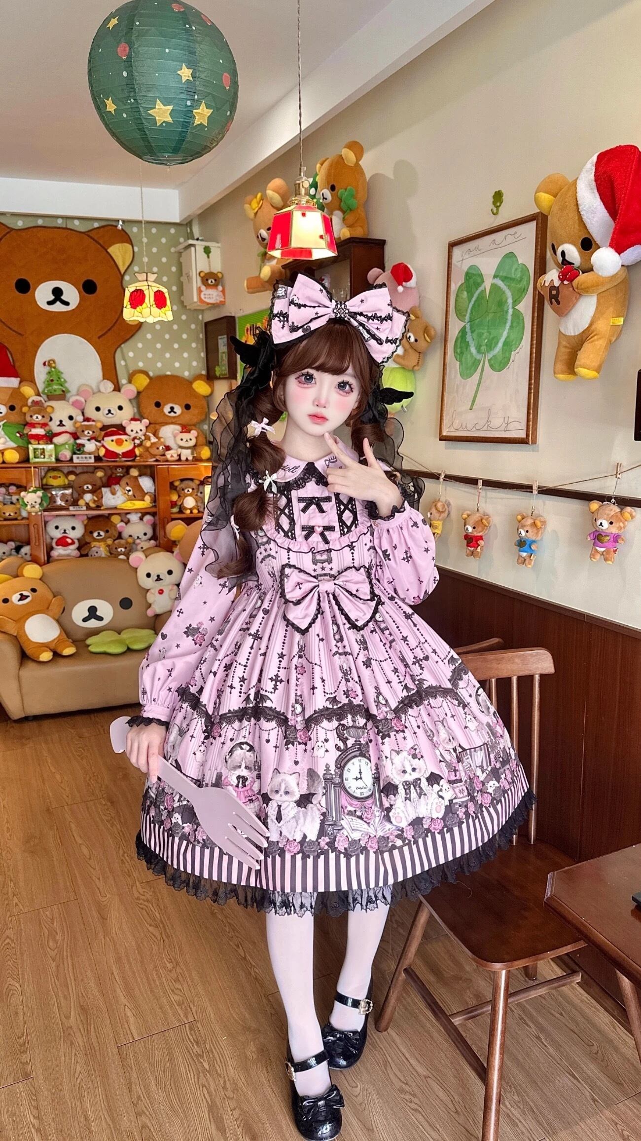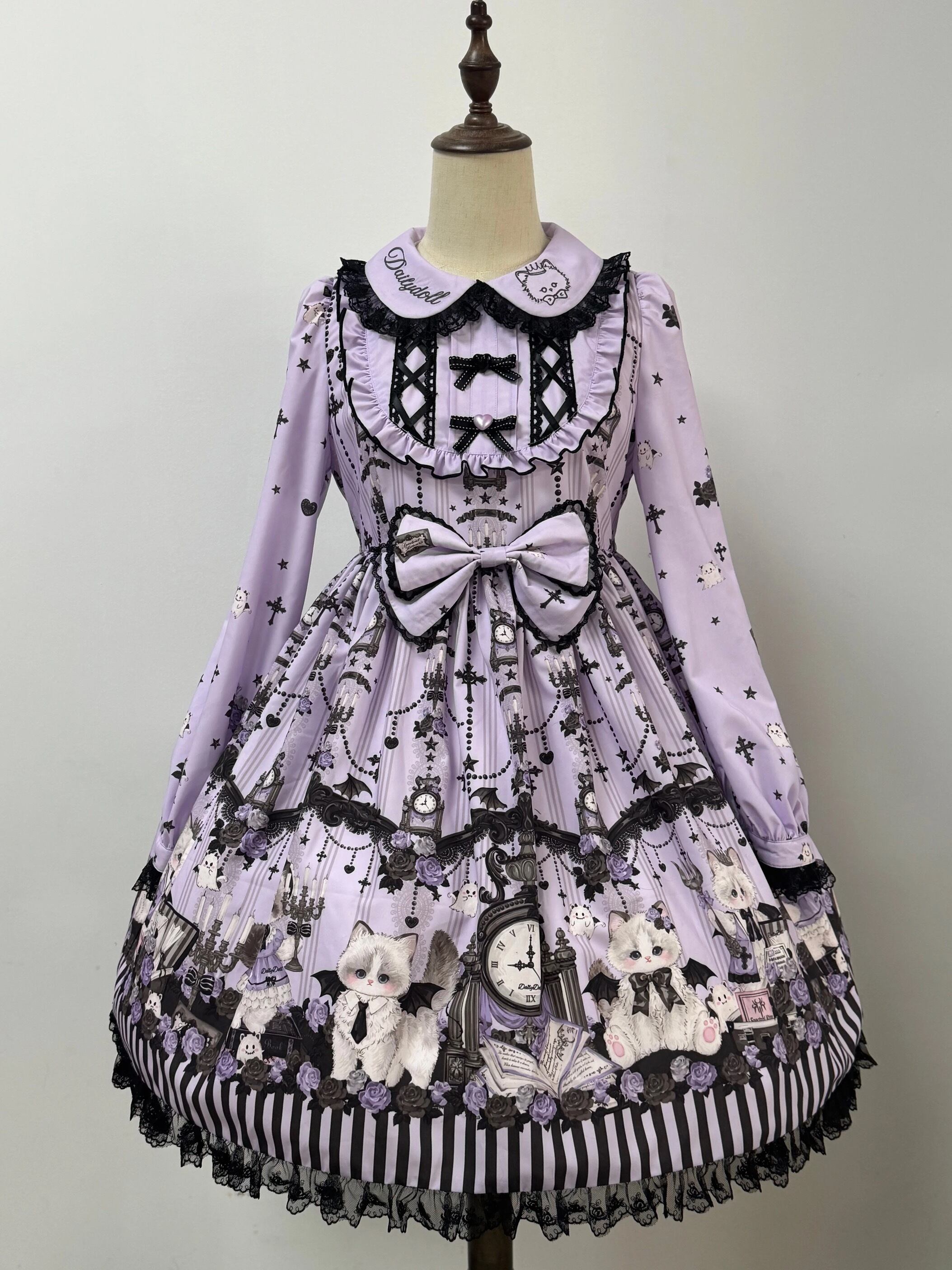 黒猫とアンティーク時計が描かれた、ロマンティックなゴスロリワンピース。