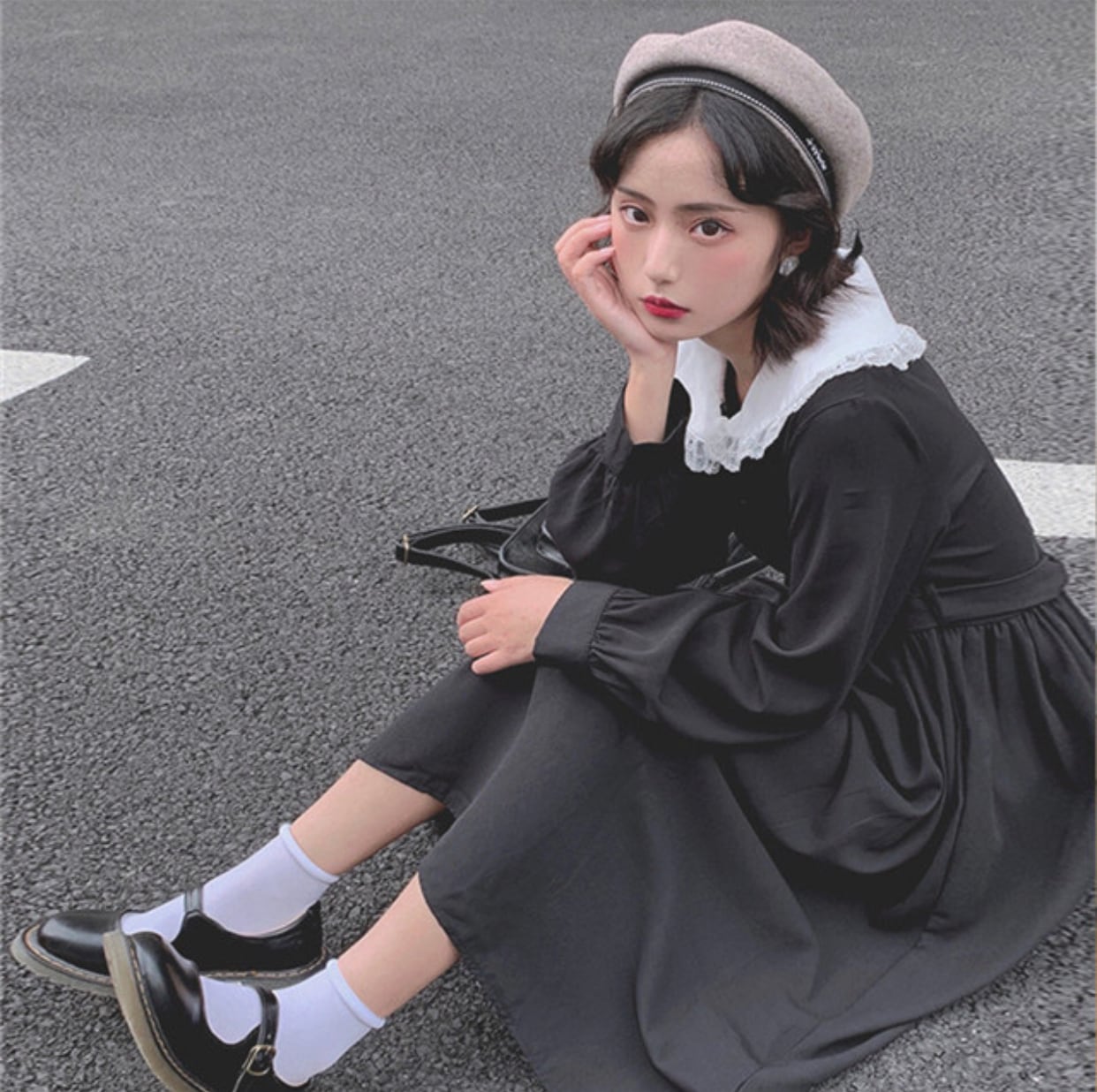 秋新作 ワンピース レディース ゴシック ゴスロリ ドレス 黒 ロリータ 長袖 膝丈 襟付き シスター