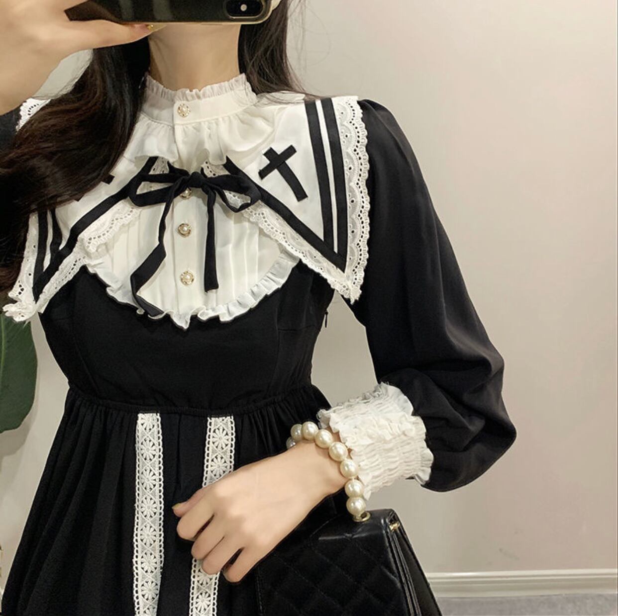 春秋 レディース ワンピース 長袖 ワンピース リボン 森ガール ハイウエスト ひざ下丈 ワンピ