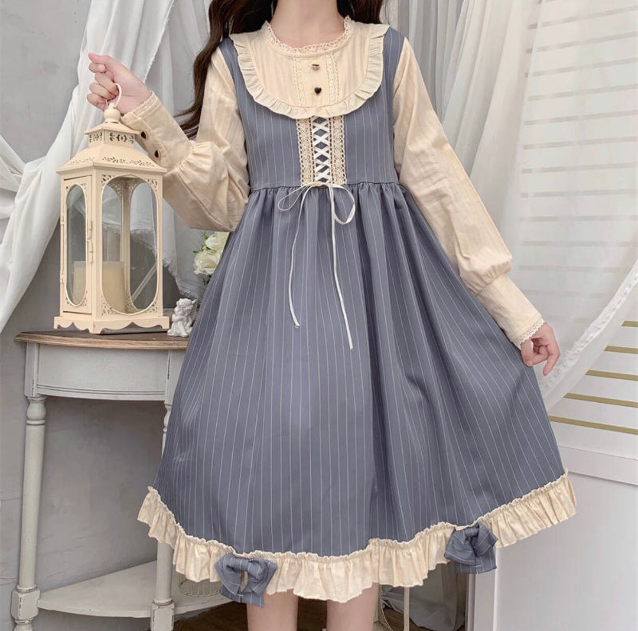 プレッピースタイル フリルとハート ロリータドレス フリル 長袖ワンピース OP