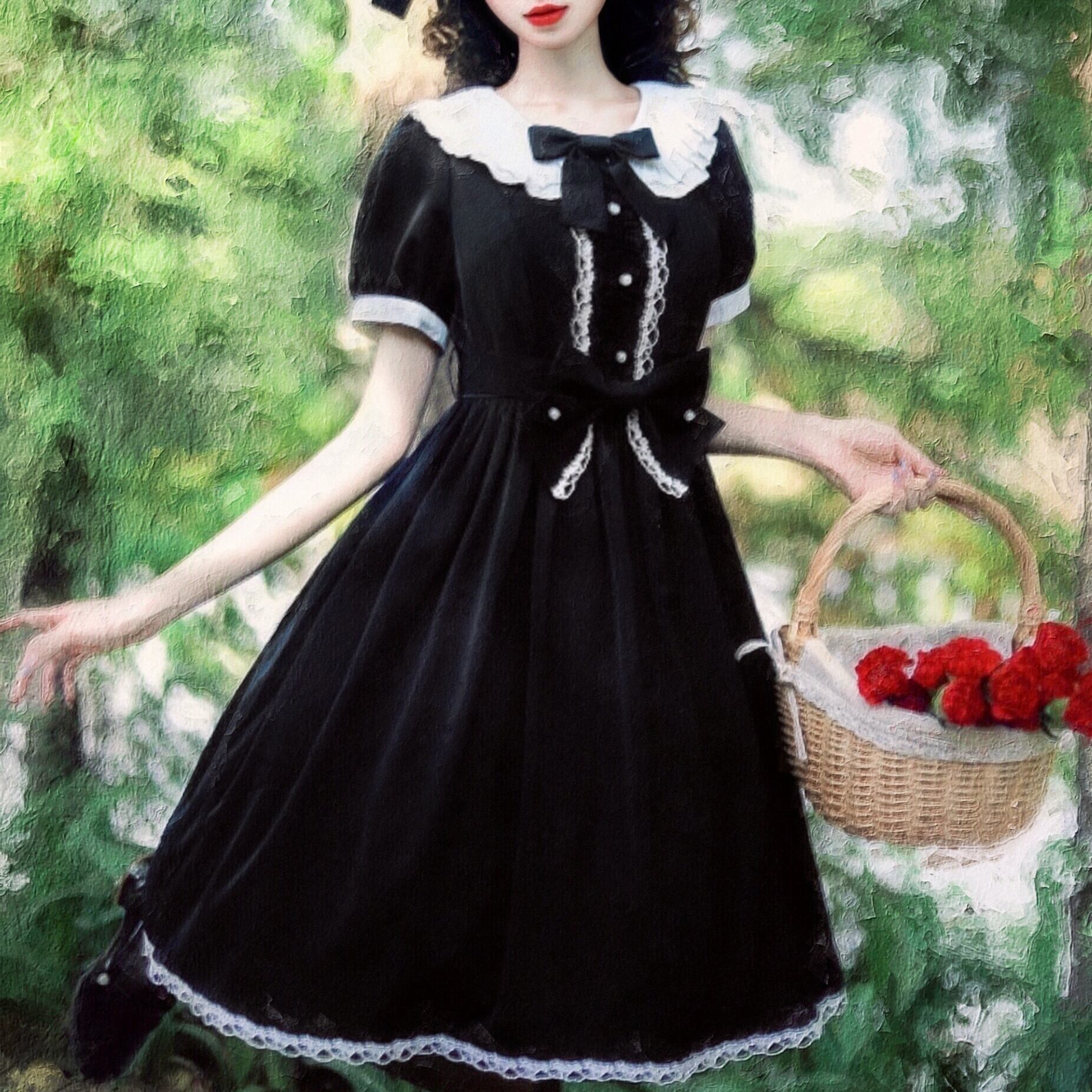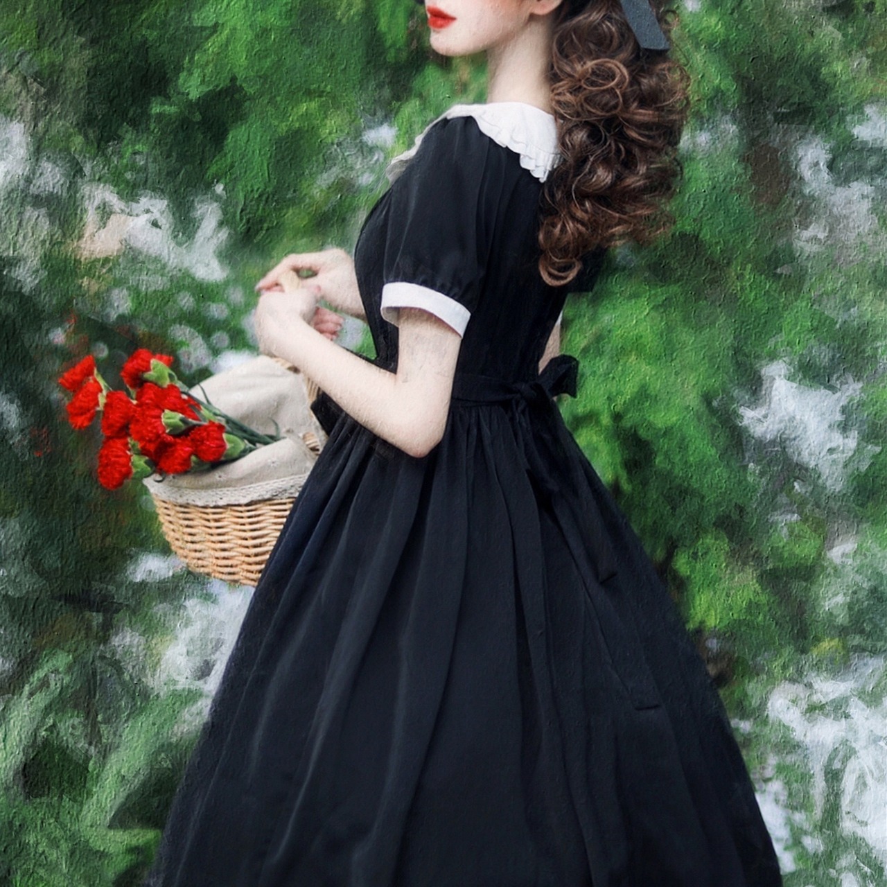 リトルガーデン ダークナイト ブラックロリータ 半袖 人形襟 かわいい ソリッドカラー ウエスト ロリータドレス