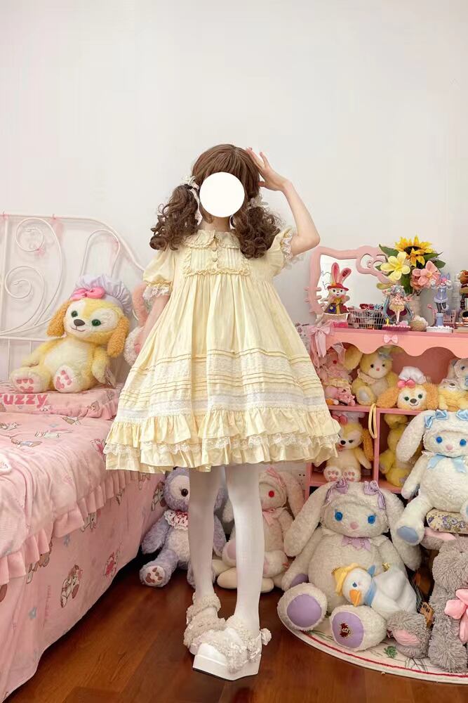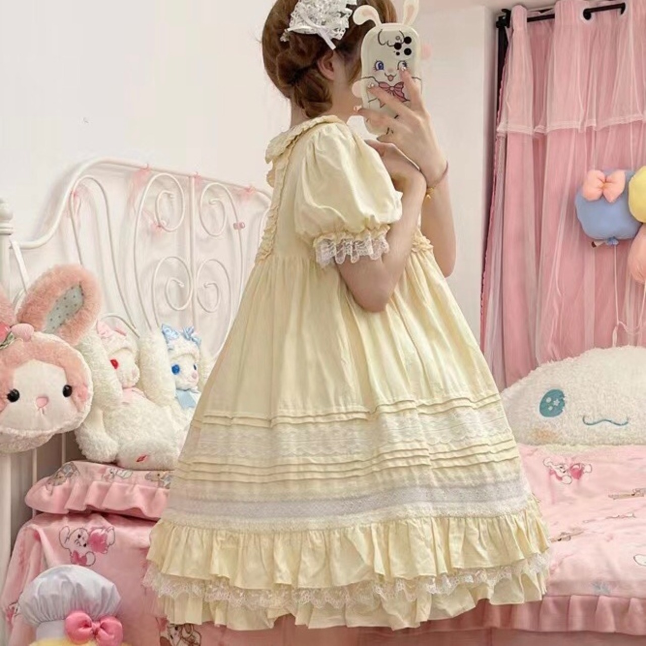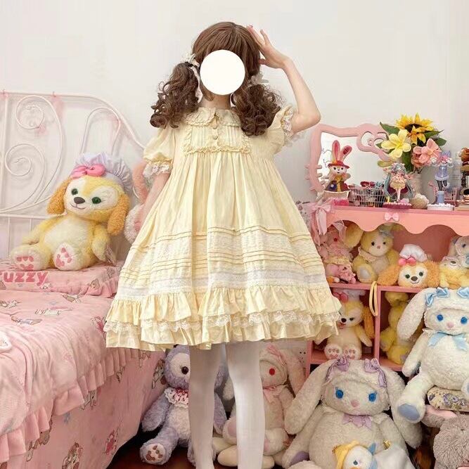 半袖ワンピース セット ロリータ バブルスリーブ レース ドレス ニュードール ルーズケーキ